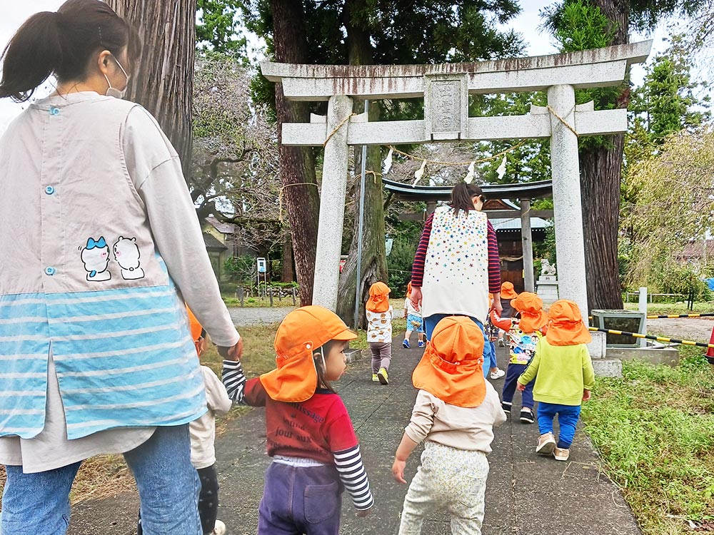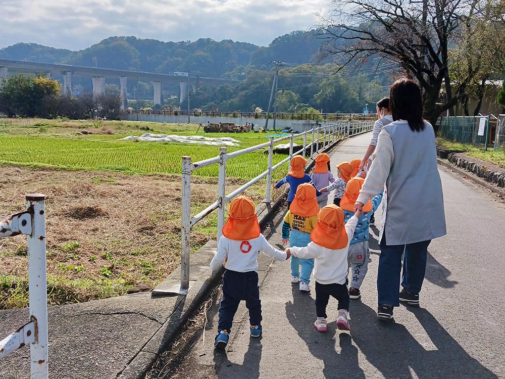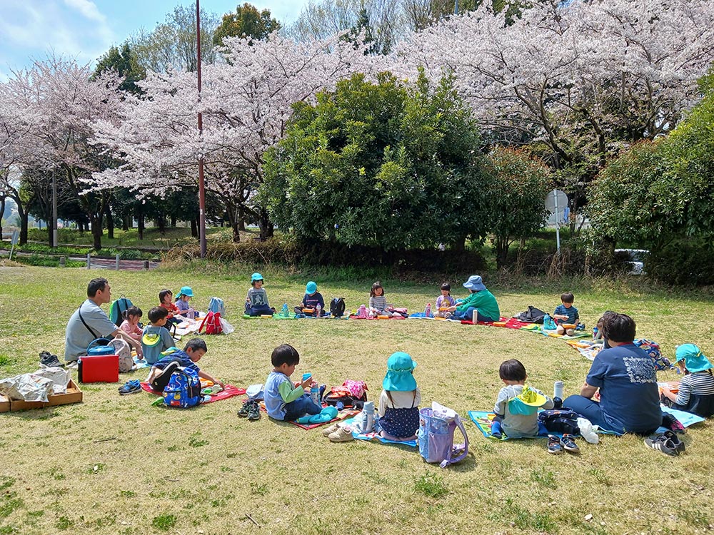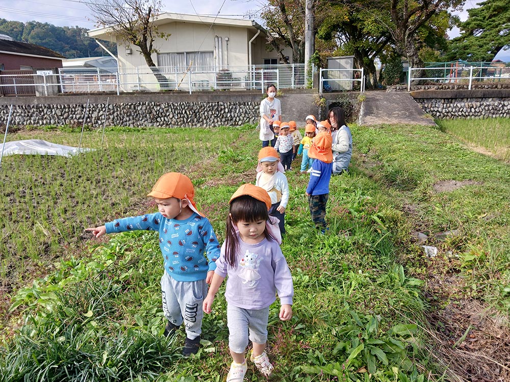 年齢に応じて近くの公園、神社、川原、田んぼなどに出かけます。