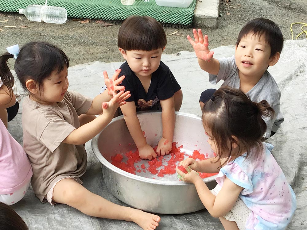 何もない広場で遊びを考え出し、遊べる子ども達の力を引き出します。身近にある物を利用して、作る事の喜びが充満している子どもの生活の場を大切にします。