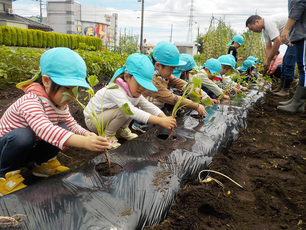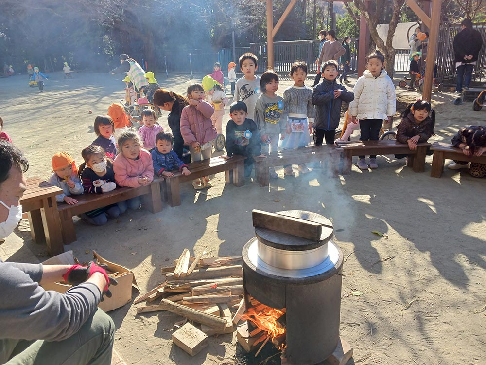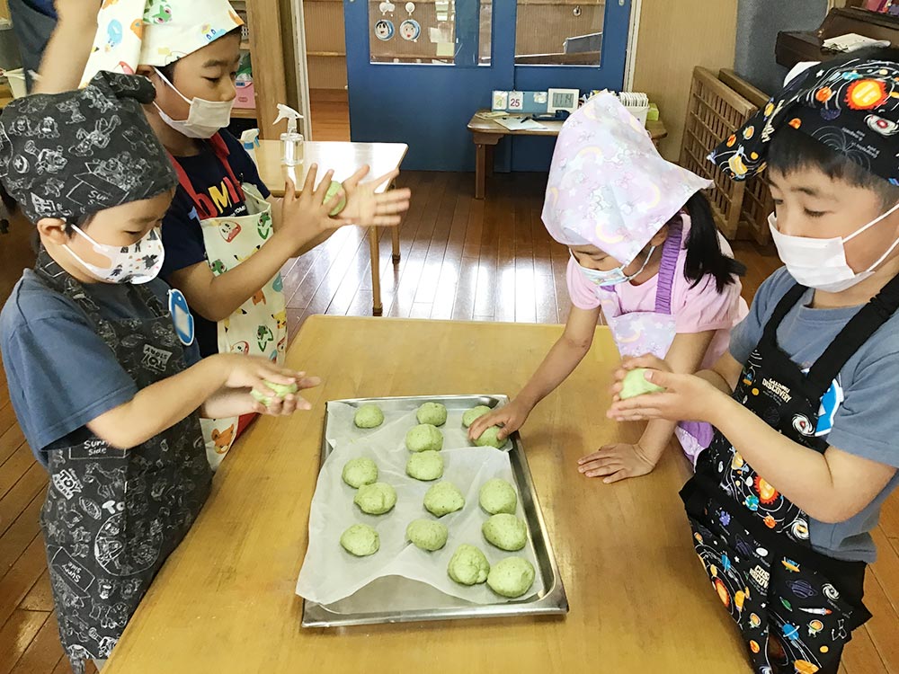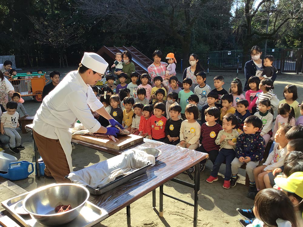 レストランごっこ、バイキング給食、保育室内調理、農作物の収穫、かまどでご飯を炊く体験、うどん作り、調理保育(月1回5歳児)